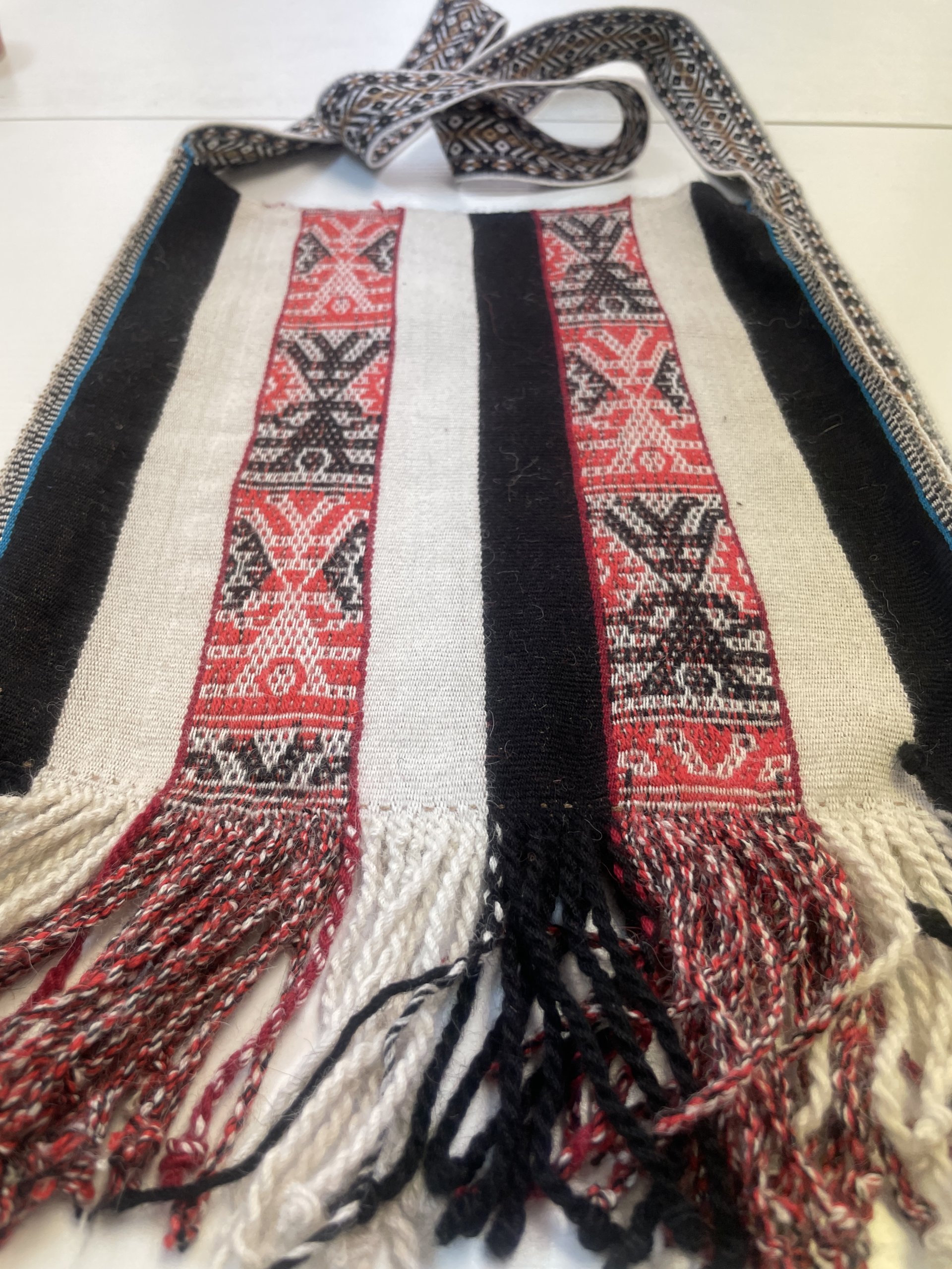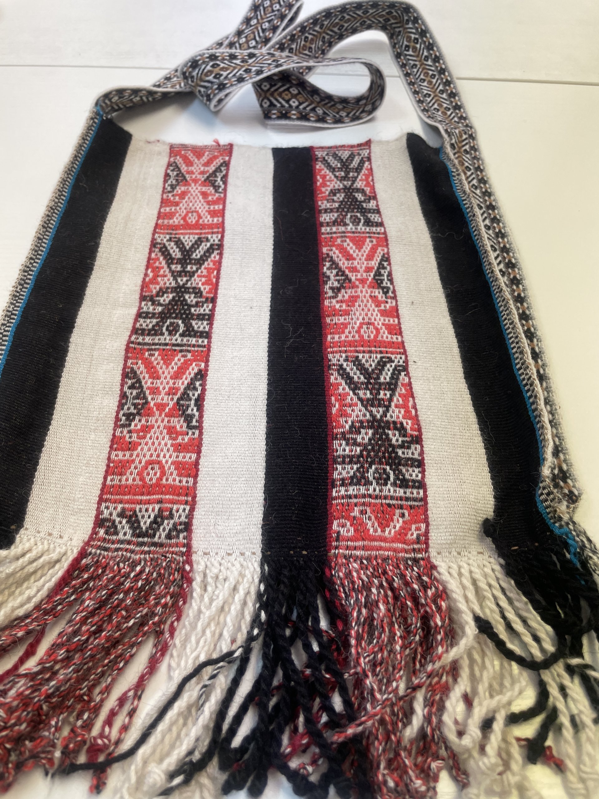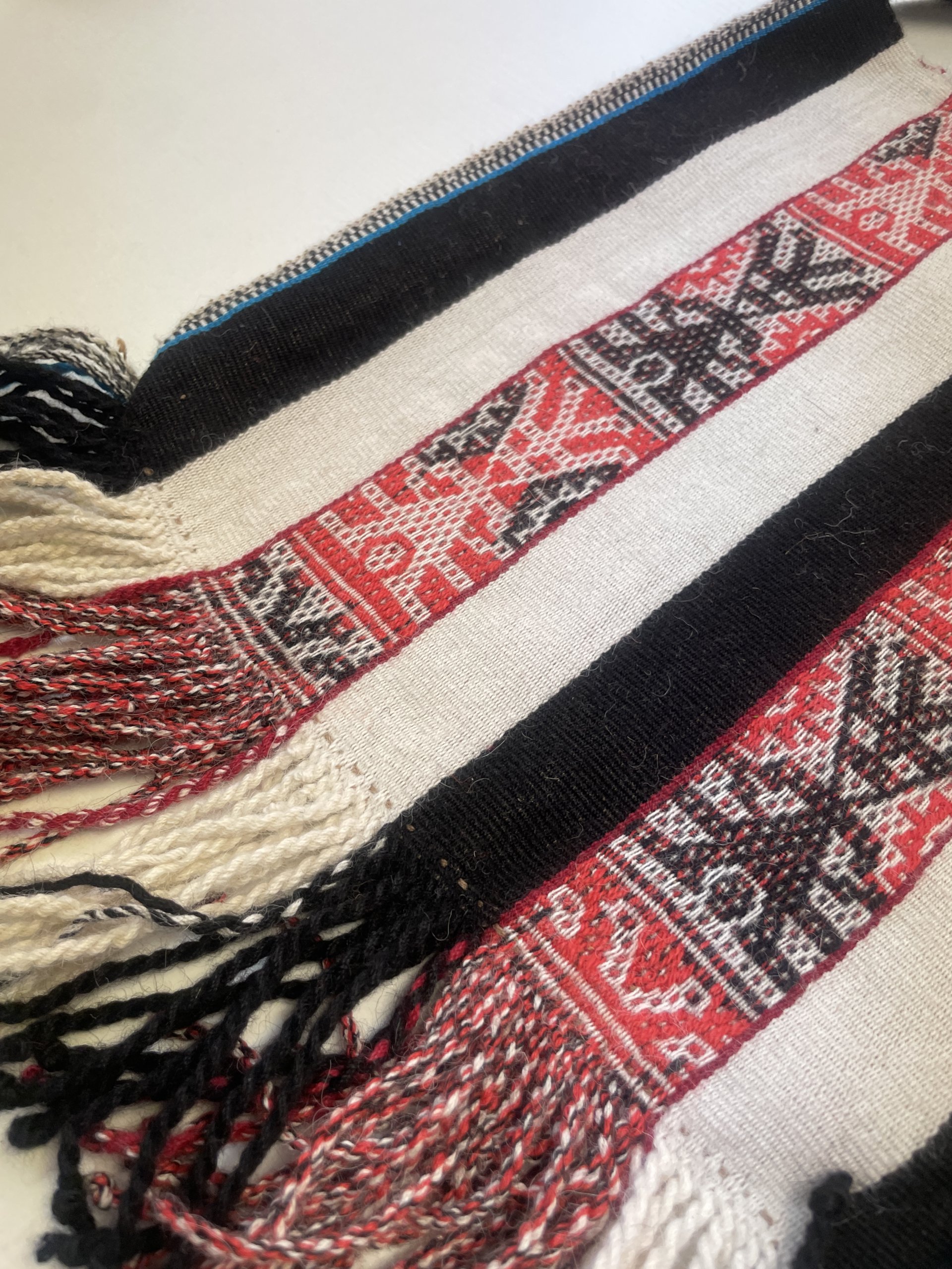 Nanci Apasa Chura used bright colors to highlight the sacred Chunchu (Inkarri) figures in this joyful chuspa bag — pinks with natural alpaca wool hues of contrasting black and soft white stripes. Nanci created this large coca bag, or chuspa kneeling on the ground, outside her home in Kiku (Quico) village in the Q’ero region of the Andes Mountains. 11 wide x 12 inches long plus fringe and a large woven strap. 28 x 31 cm. Your purchase helps Nanci, her family, and her community to preserve culture and build a more stable life. A photo of Nanci holding this bag is included with your purchase.
