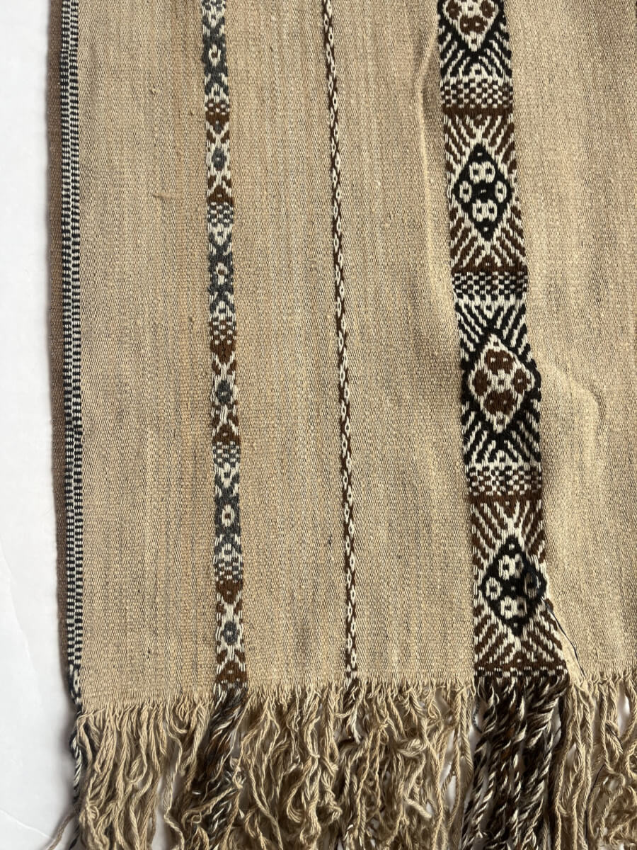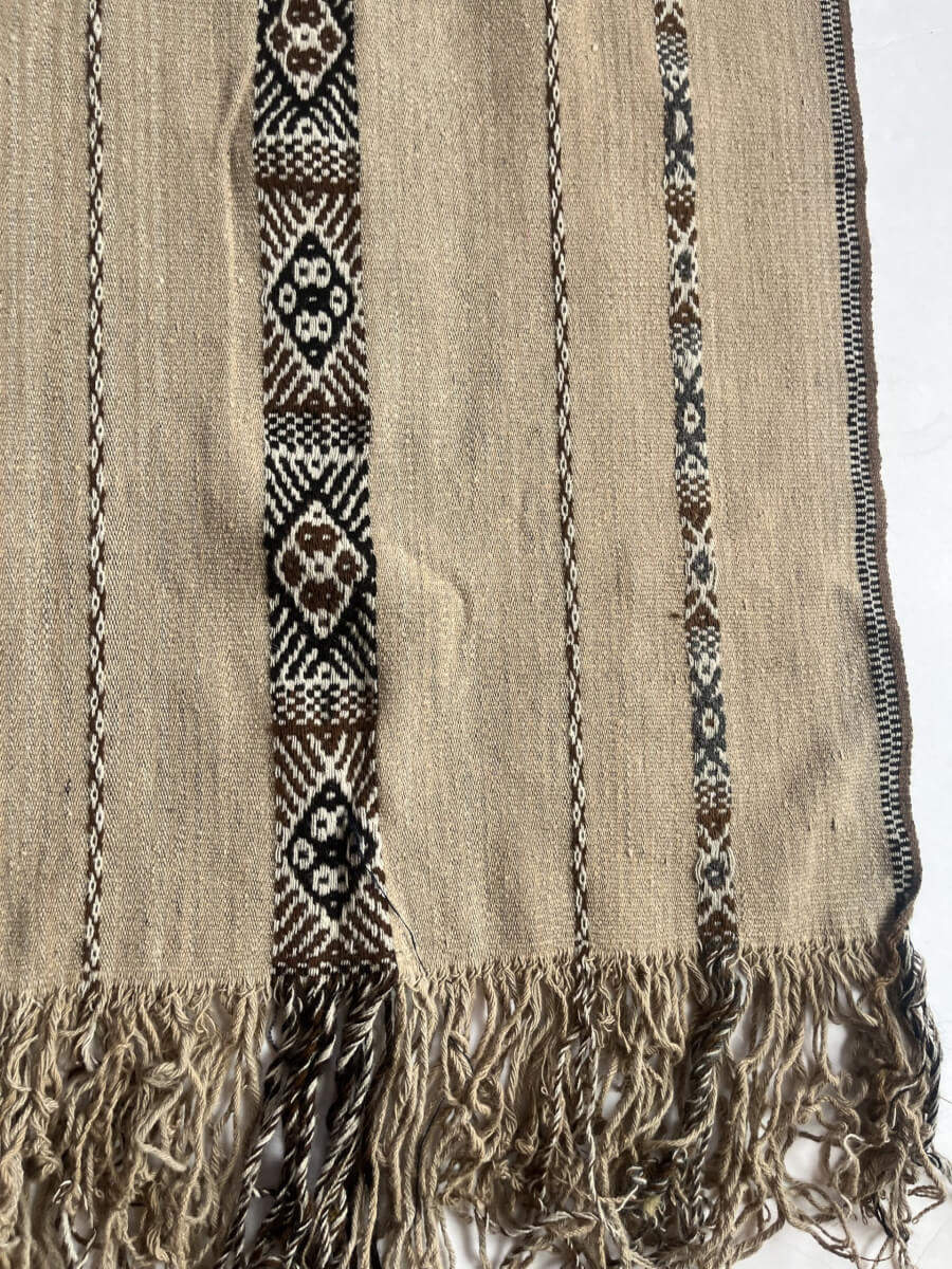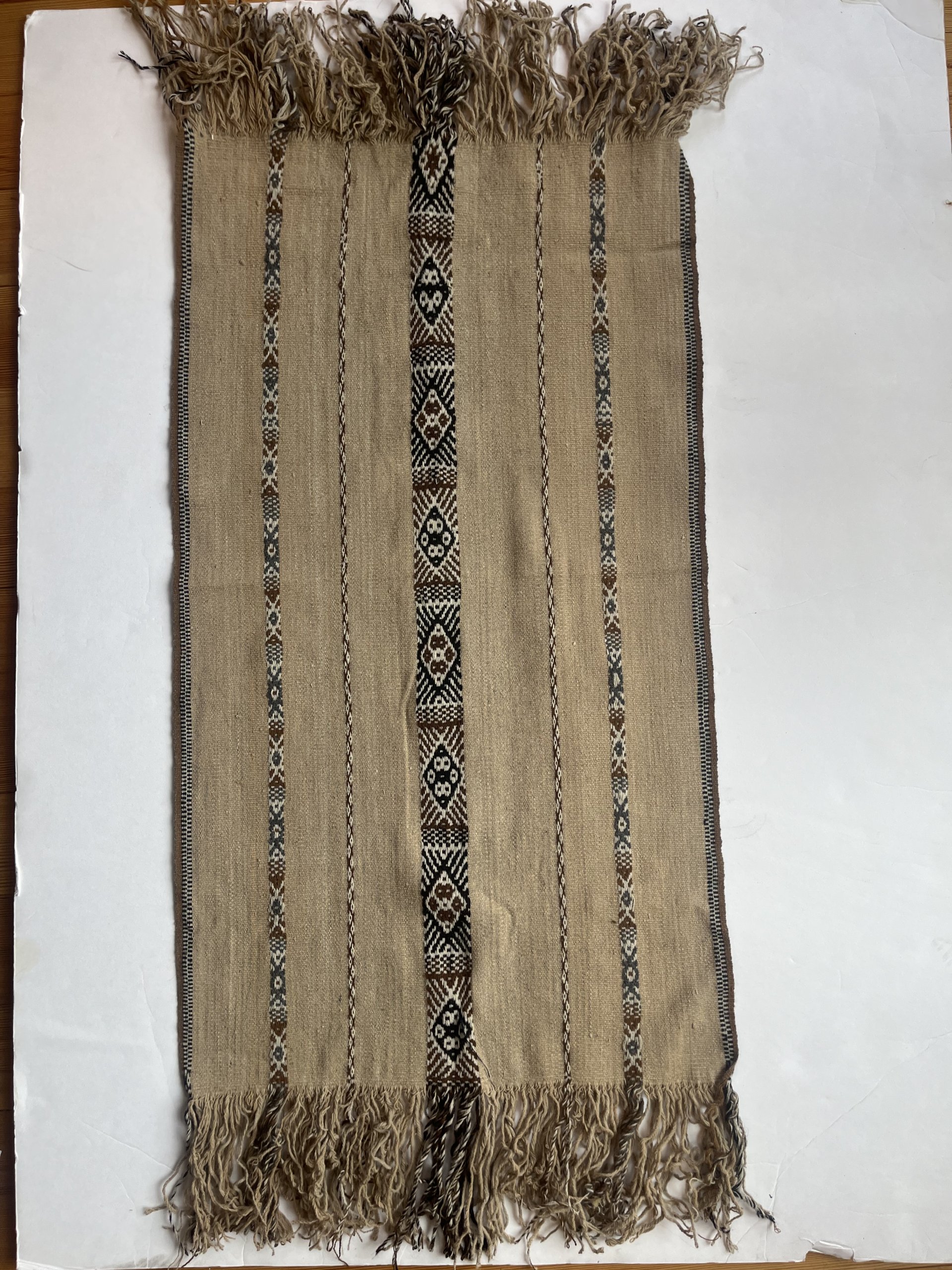 This soft, earth-toned runner is rich with texture and depth. It is woven by Justiana Apasa Samata from Hapu Q’eros. This textile is made from hand spun alpaca threads, each color the natural colors from Justiana’s alpaca herd. It has beautifully wild fringe on each end and measures 17.5 inches wide x 30 inches long plus fringe. 44 x 76cm. A photo of Justiana holding this textile is included with the purchase.