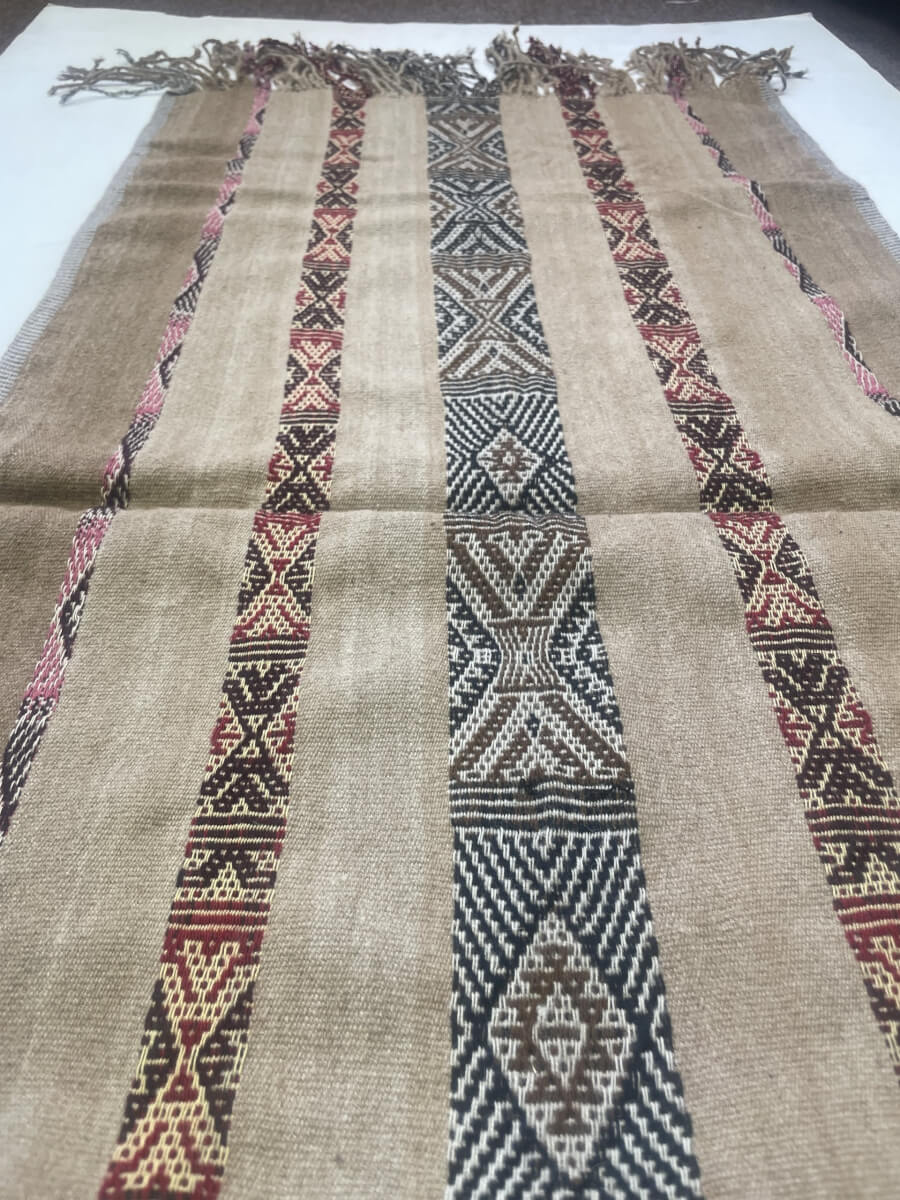 This stunning ceremonial textile is masterfully woven by Susana Apasa Samata, from Hapu Q’eros. Made from hand-spun alpaca yarns in their natural fiber hues, its Earth honoring colors depict Ch’unchu and Inti symbols. This long table textile measures 42 inches long + fringe, 19.5 inches wide (107 x 50 cm). The main color is warm tan, best depicted in the outdoor photo with the weaver. A photo of the weaver holding your new textile is included with the purchase.