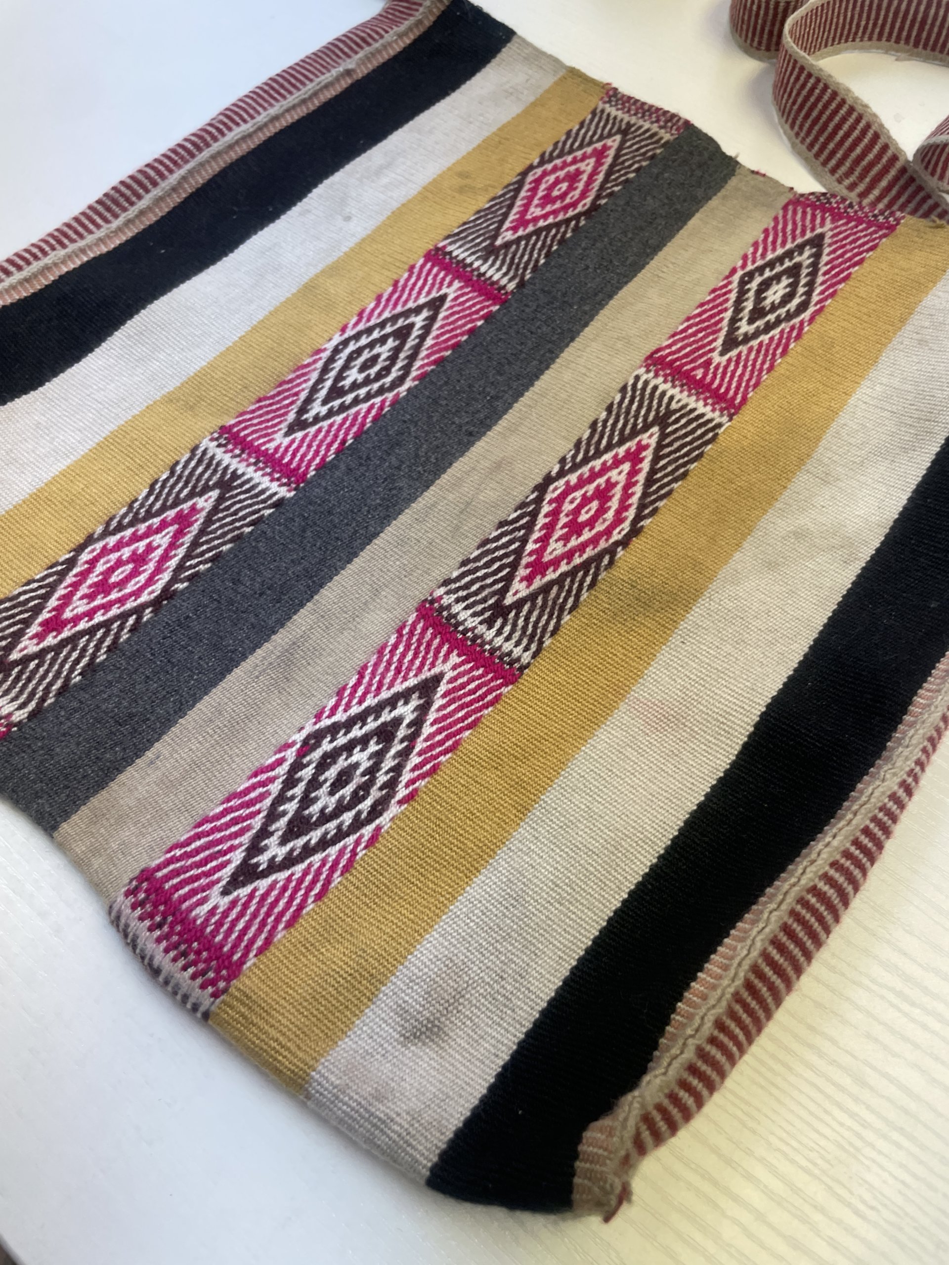 This coca bag (chuspa) is woven of hand spun alpaca hair with sacred symbols of Inti (Sun God). It is large and durable enough to hold a mesa, rattles and a notebook. Weaver Nancy Apasa Chura wove this bag outdoors, kneeling over her loom, in her small Q’ero village of Kiku (Quico) in the Andes Mountains of Peru. All proceeds from this sale directly help Nancy, her family, and her community build a more stable life and preserve their beautiful culture in one of the most remote villages of the Andes Mountains. 12 W x 12 L Square. 31 wide x 31. Purchase includes a photo card of Nancy holding the chuspa in her village of Quico.