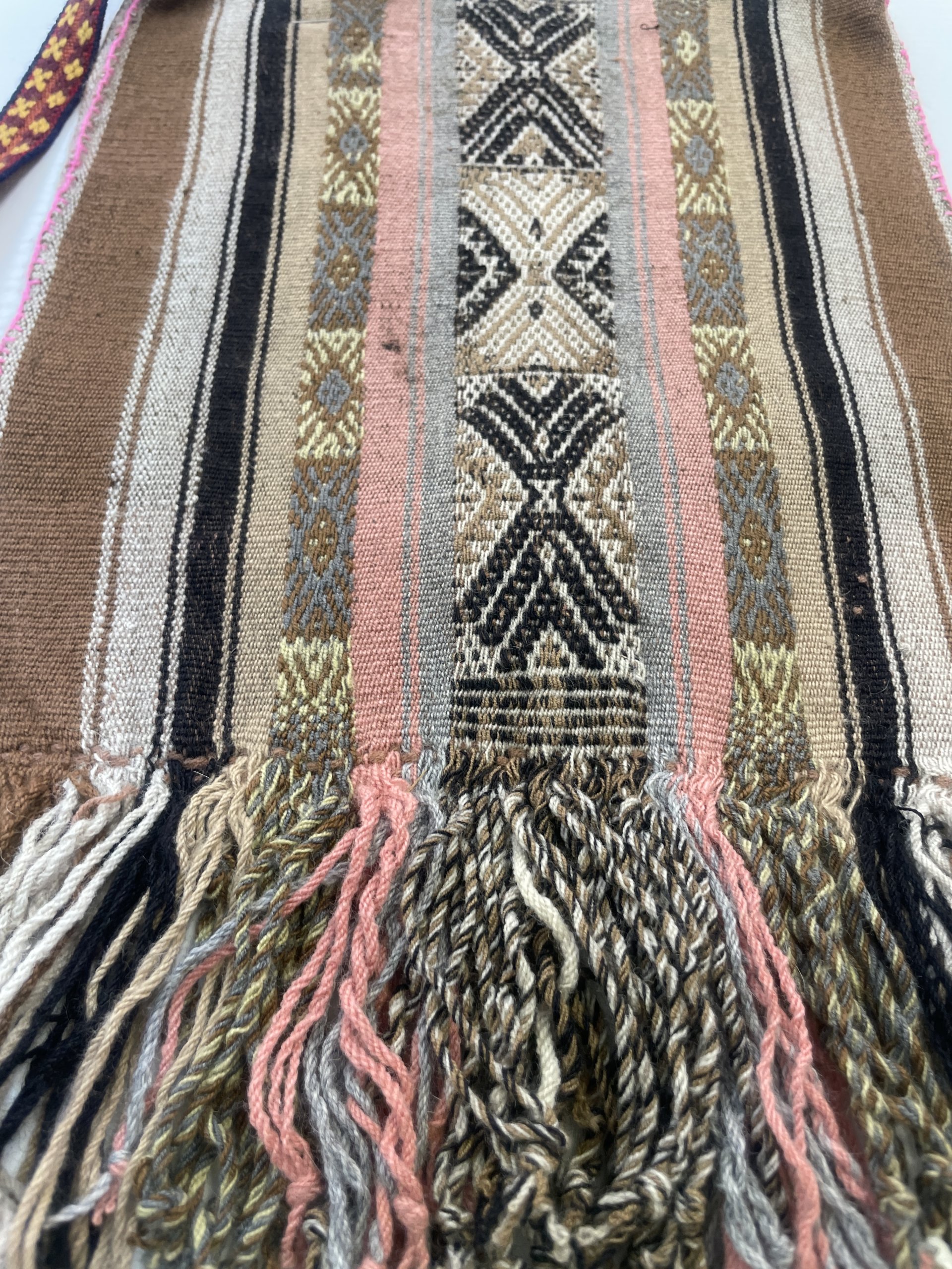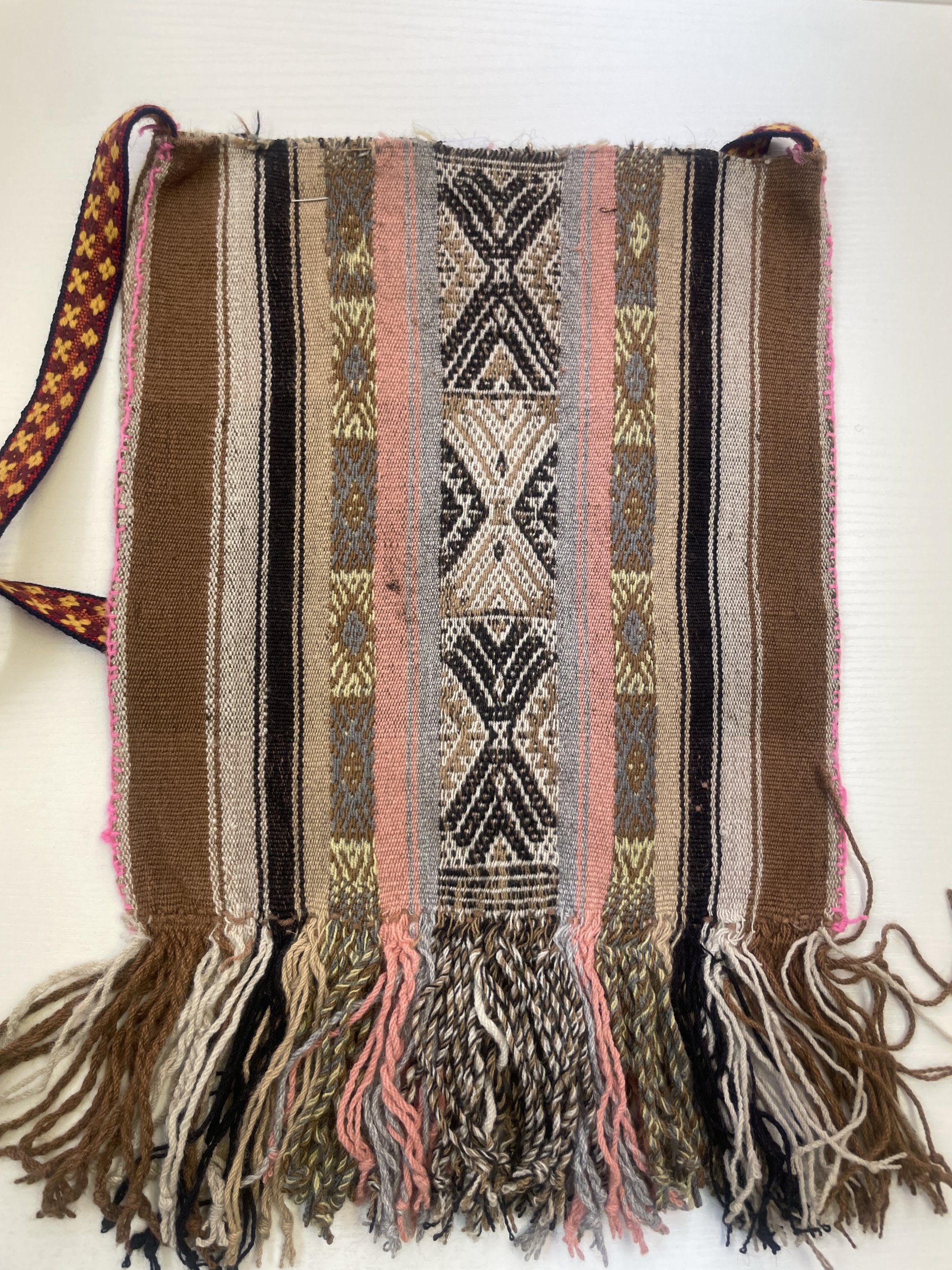 A variety of natural colors of alpaca fibers frame a band of sacred Chunchu (Inkarri) lined with soft pink bands of natural dyes. This traditional Q’ero coca bag, or chuspa was woven by master weaver Deonicia Apasa Machaca, who hand spun the pure alpaca fiber into fine yarns. She created this traditional coca bag, or chuspa, kneeling on the ground outside her home village of Kiku (Quico) in the Q’ero region of the Andes Mountains. 10″ wide x 11″ long plus fringe and strap. 27 x 30 cm. Your purchase helps the weaver, her family and her community to preserve culture and build a more stable life. Photo of Deonicia holding this bag is included with your purchase.