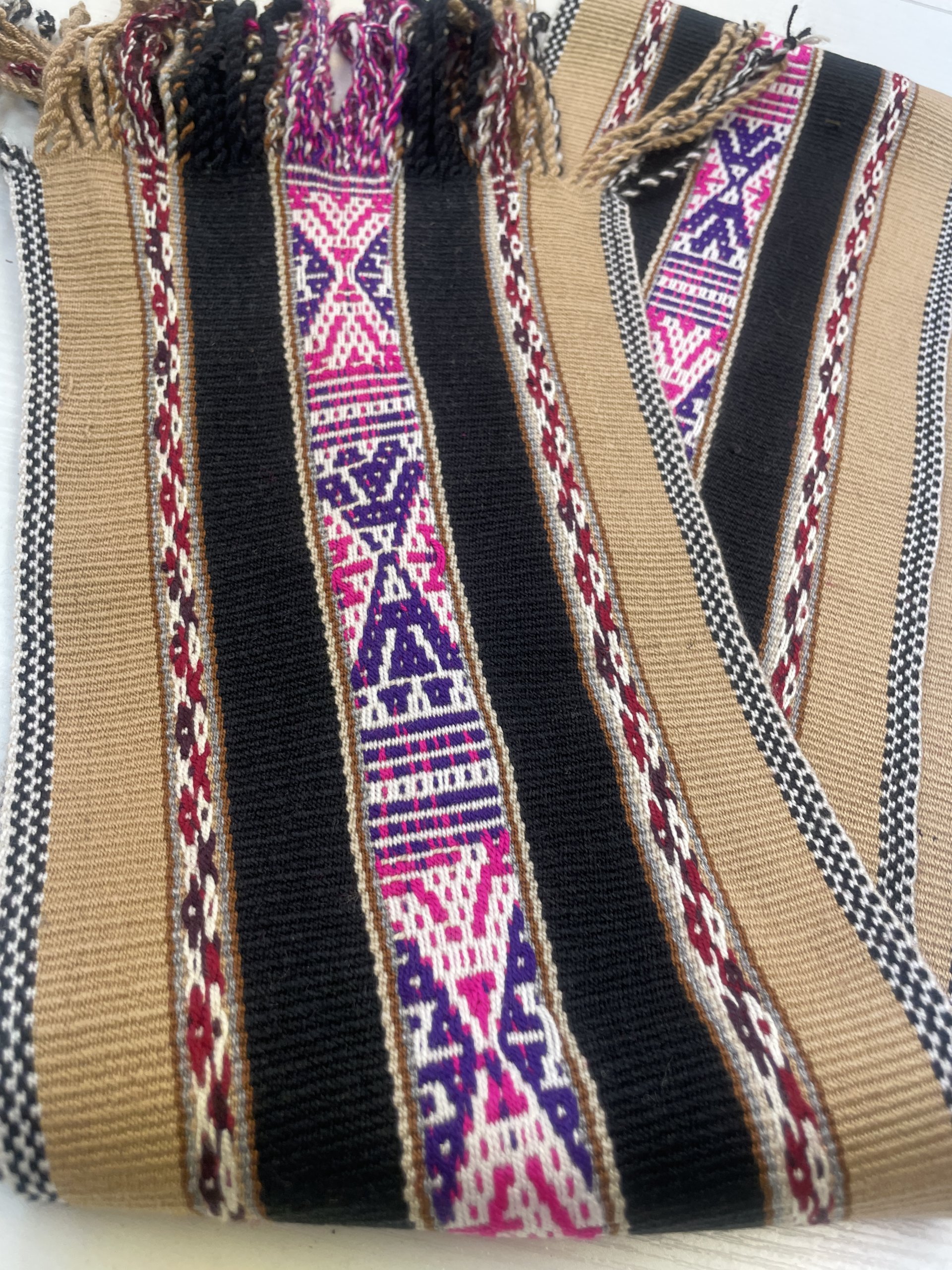 This attractive scarf is soft and cheerful. Bright contemporary colors of pink and purple make a striking contrast to the black and tan bands. Augustina Ccapa Mamani is the young weaver who expertly wove this long and lovely scarf. Heart Walk Foundation buys textiles from each weaver in each community. We see the art and tradition of weaving as sacred, and celebrate the fact that everyone participates in keeping this knowledge alive, so we buy textiles from the very young weavers to the elderly. This project supports everyone and we are sure that you will love this scarf made by young Augustina. Your purchase helps her support her family and live with dignity. 56 x 7 inches plus fringe. 142 x 17 cm.