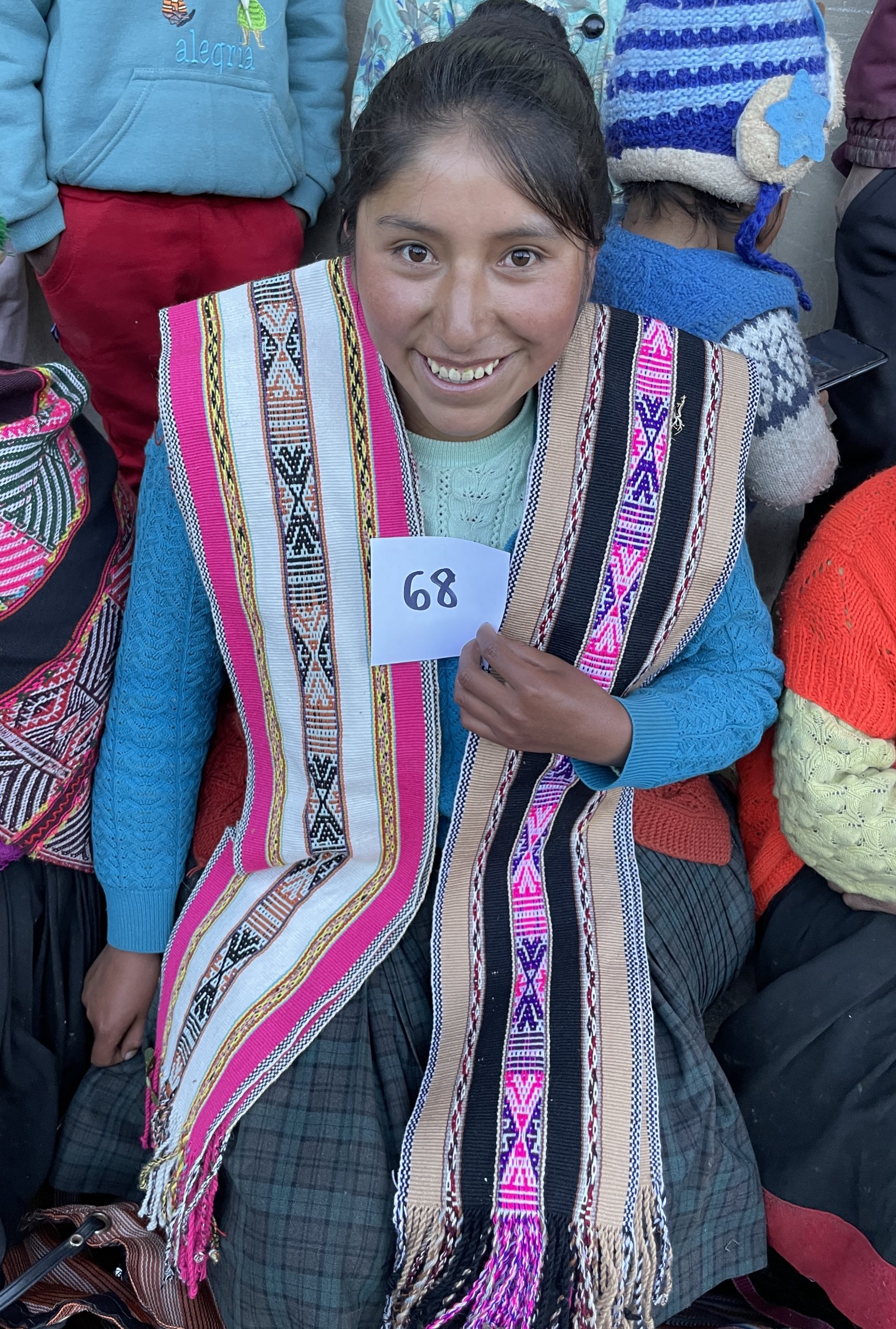 This striking pink scarf is soft and cheerful. Bright pink and white bands frame the Ch’unchu figures. Augustina Ccapa Mamani is the young weaver who expertly wove this long and lovely scarf. Heart Walk Foundation buys textiles from each weaver in each community. We see the art and tradition of weaving as sacred, and celebrate the fact that everyone participates in keeping this knowledge alive, so we buy textiles from the very young weavers to the elderly. This project supports everyone and we are sure that you will love this scarf made by young Augustina. Your purchase helps her support her family and live with dignity. 56 x 7 inches plus fringe. 142 x 17 cm.