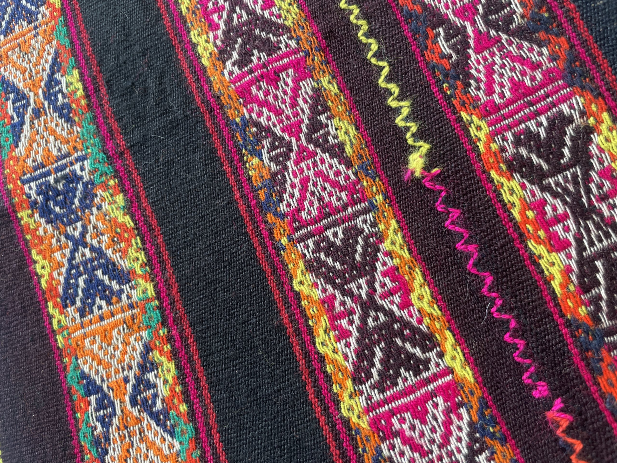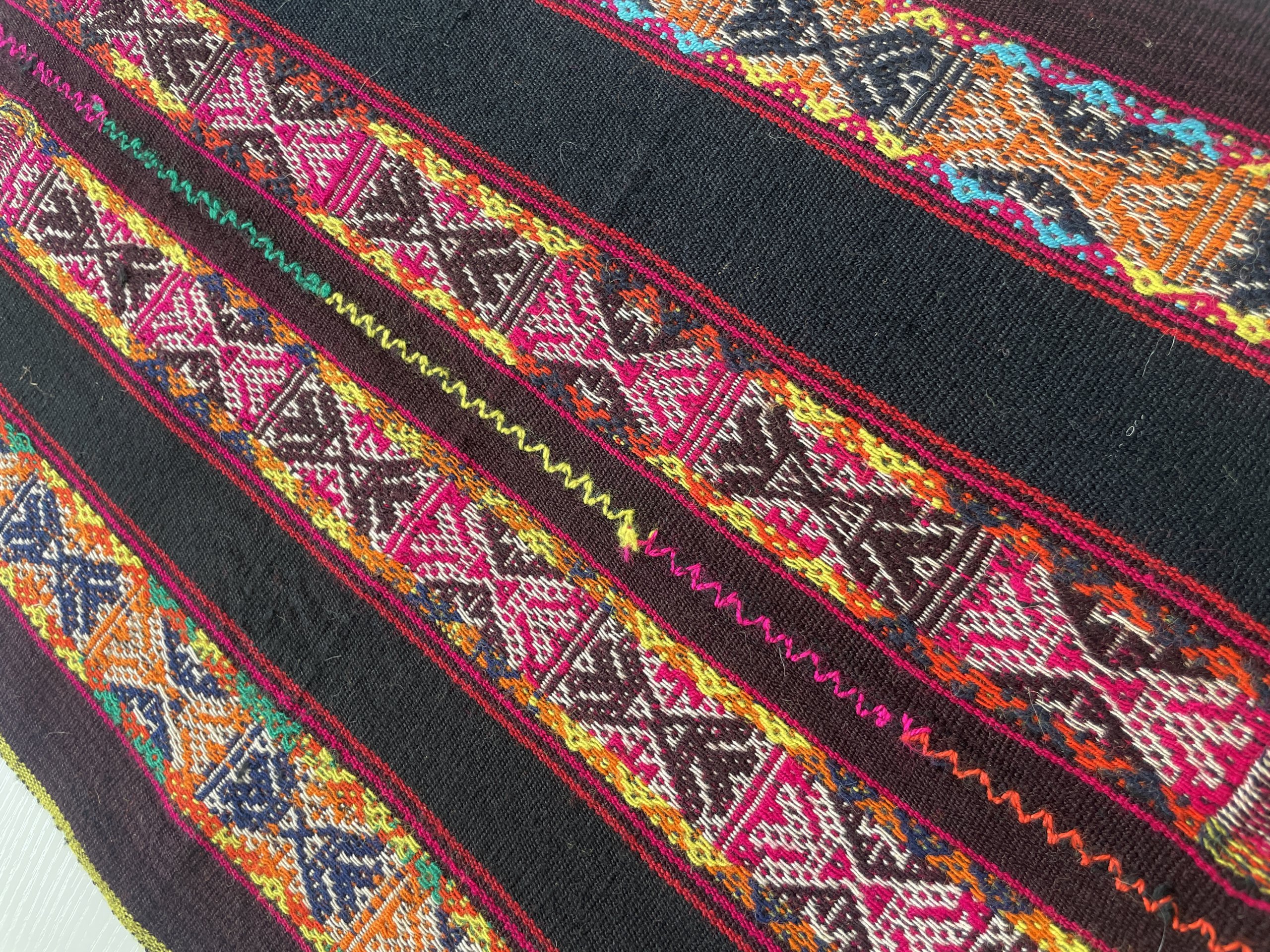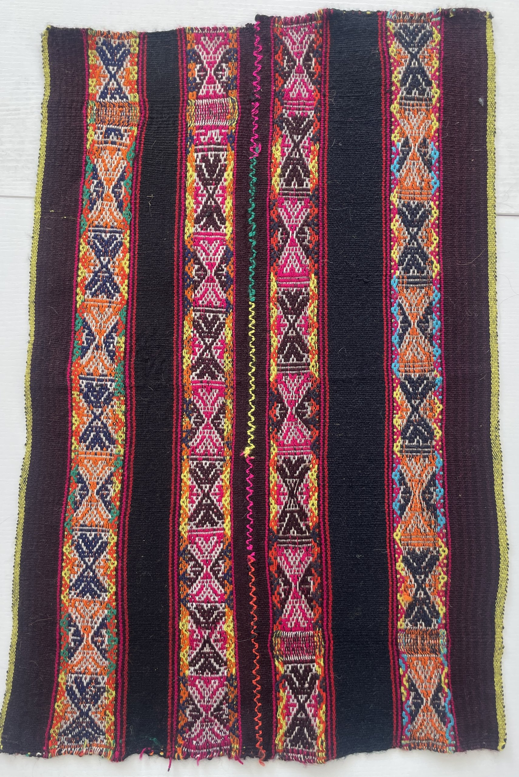 This small, playful lliklla is decorated with organized rows of colorful Inkarri figures. Benedicta Apasa Flores created this beautiful ceremonial lliklla, possibly for one of her own daughters. Benedicta weaves on a four post loom pounded into the ground with sticks and rocks just outside her home in Quico Q’eros, Your purchase helps Benedicta and her family to build a more sustainable life. Thank you for supporting traditional Q’ero culture.  The textile measures 24  x 16  inches. 61 x 41 cm.