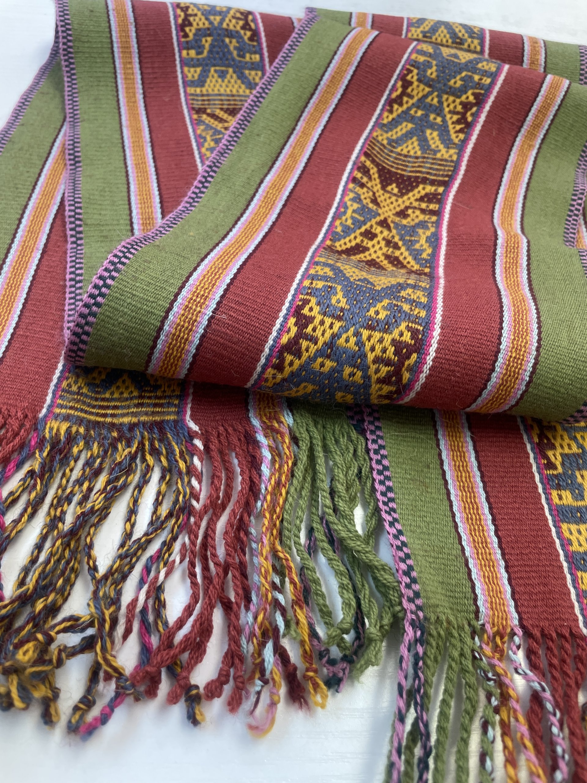 This precious scarf is soft and delicate. Each cheerful color is dyed with natural plant dyes, creating a gentle warmth, bright but subtle. This piece of art is thin and finely woven, very soft to the touch. It can be worn as a scarf, or used as a runner or wall hanging. Nelly Gerillo Phacsi is a master weaver in her community of Quico. A photo of Nelly holding this long and beautiful scarf is included with purchase.Heart Walk Foundation buys textiles from each weaver in each community. We see the art and tradition of weaving as sacred, and celebrate the fact that everyone participates in keeping this knowledge alive, so we buy textiles from the very young weavers to the elderly. This project supports everyone and we are sure that you will love this scarf made by Nelly. Your purchase helps her support her family and live with dignity. 68 x 7 inches plus fringe. 174 x 17.5 cm.